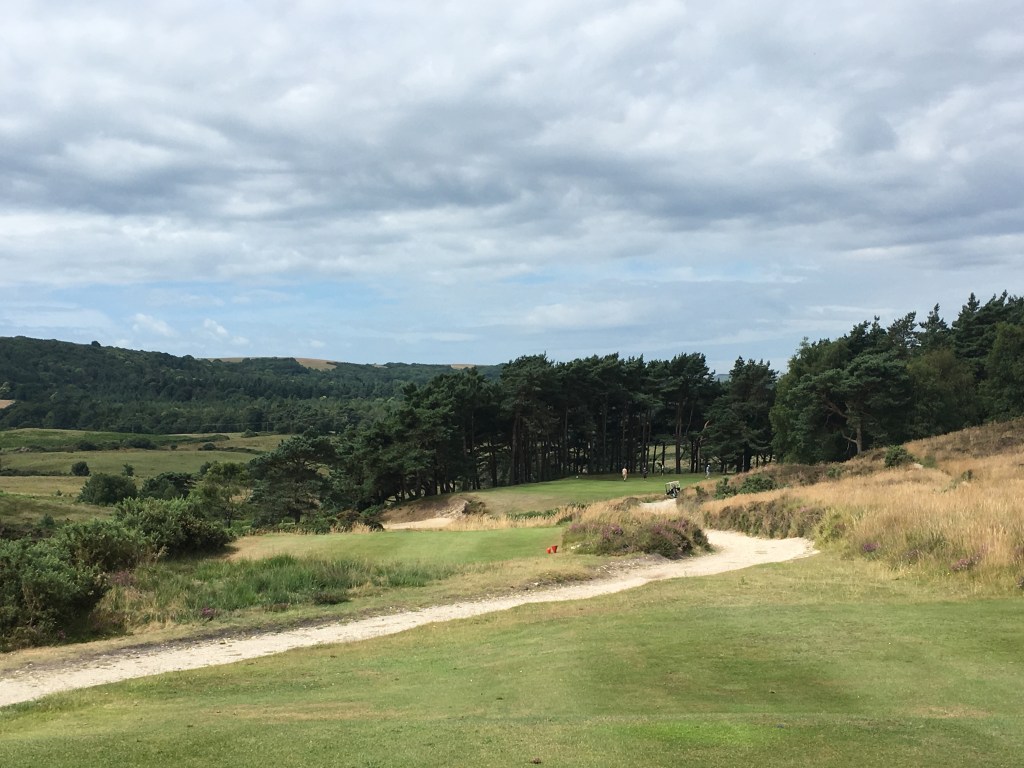 - 11th – an excellent par 3 that is another that lasts in the memory. Played downhill over heather and gorse towards a deceptively large green with a perilously deep bunker front left but which is framed beautifully by a collection of tall pine trees to the rear.