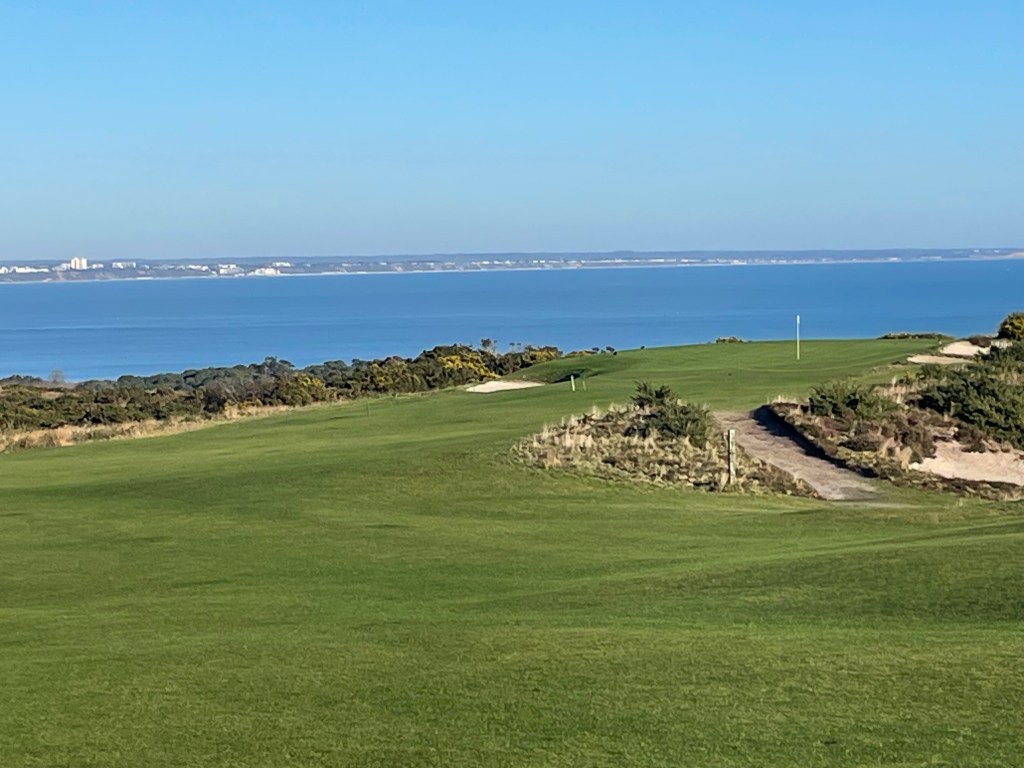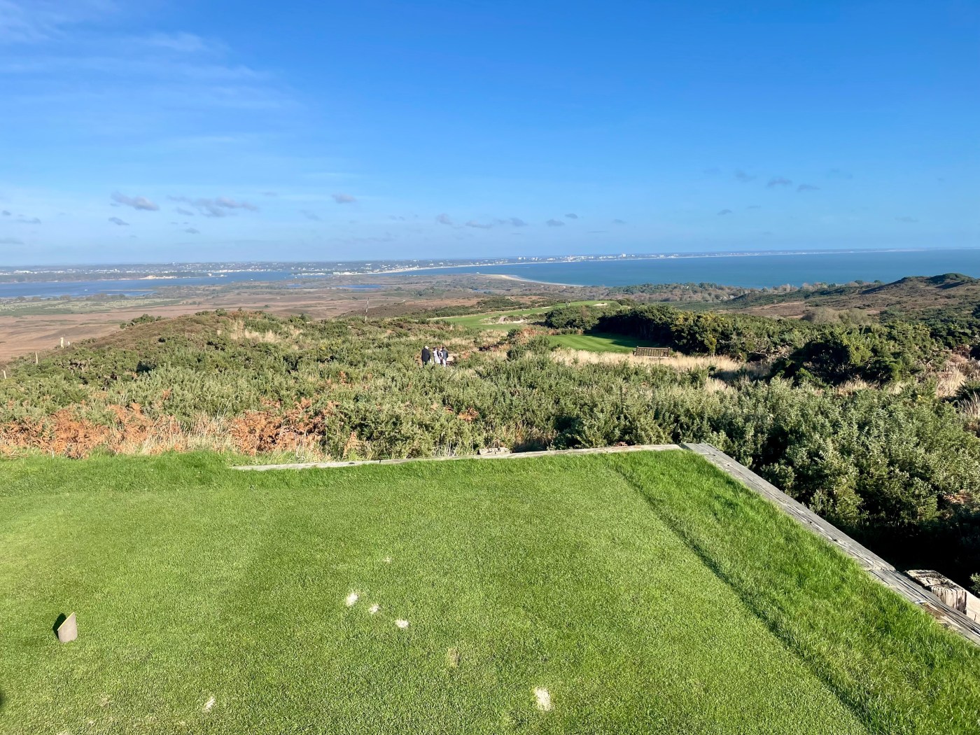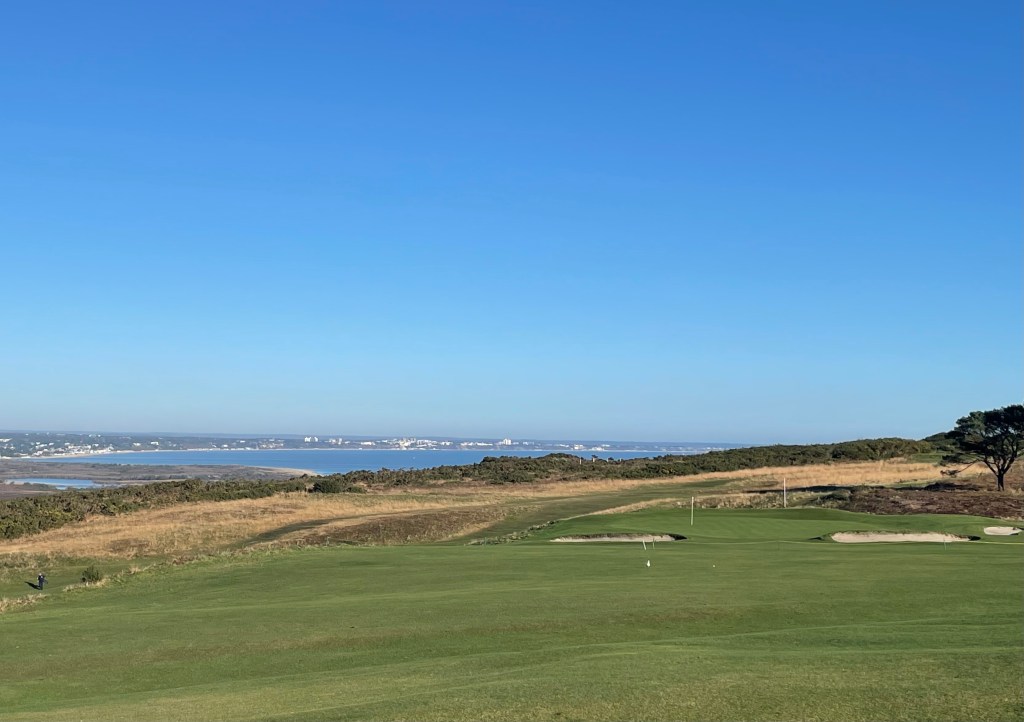 - 5th – a spectacular and challenging hole, a real show-stopper. Breathtaking views of Poole bay from an elevated tee, formerly an Iron Age burial ground, to a hidden fairway below which doglegs right to an infinity green with Studland Bay beyond.