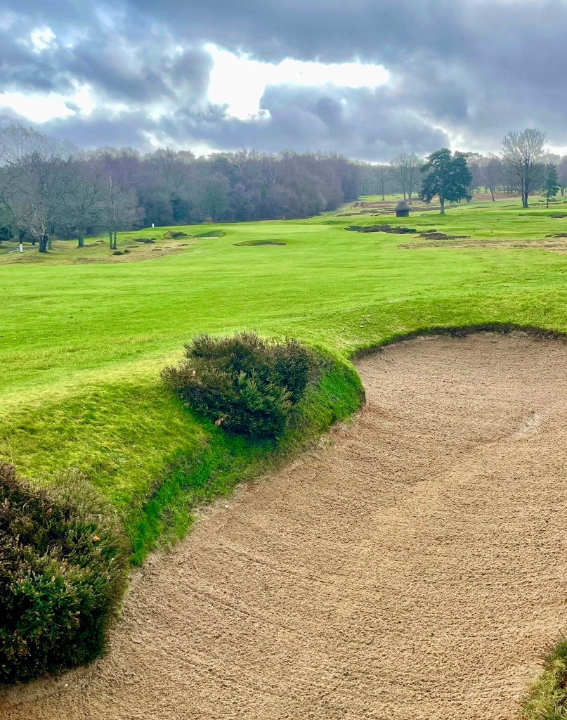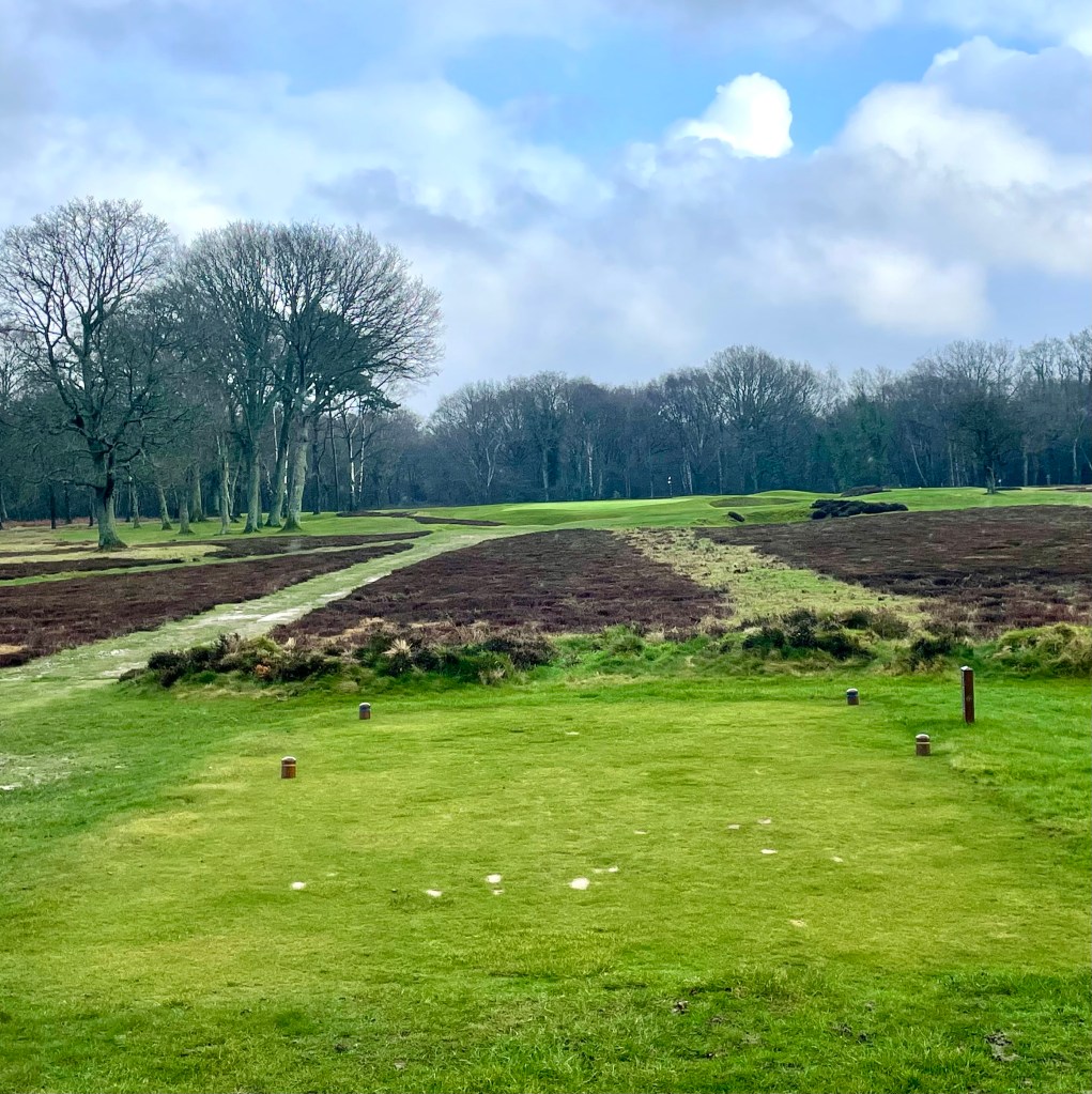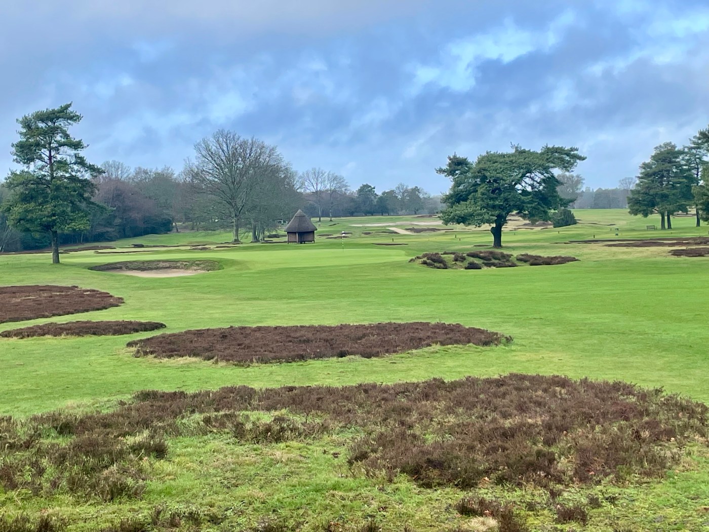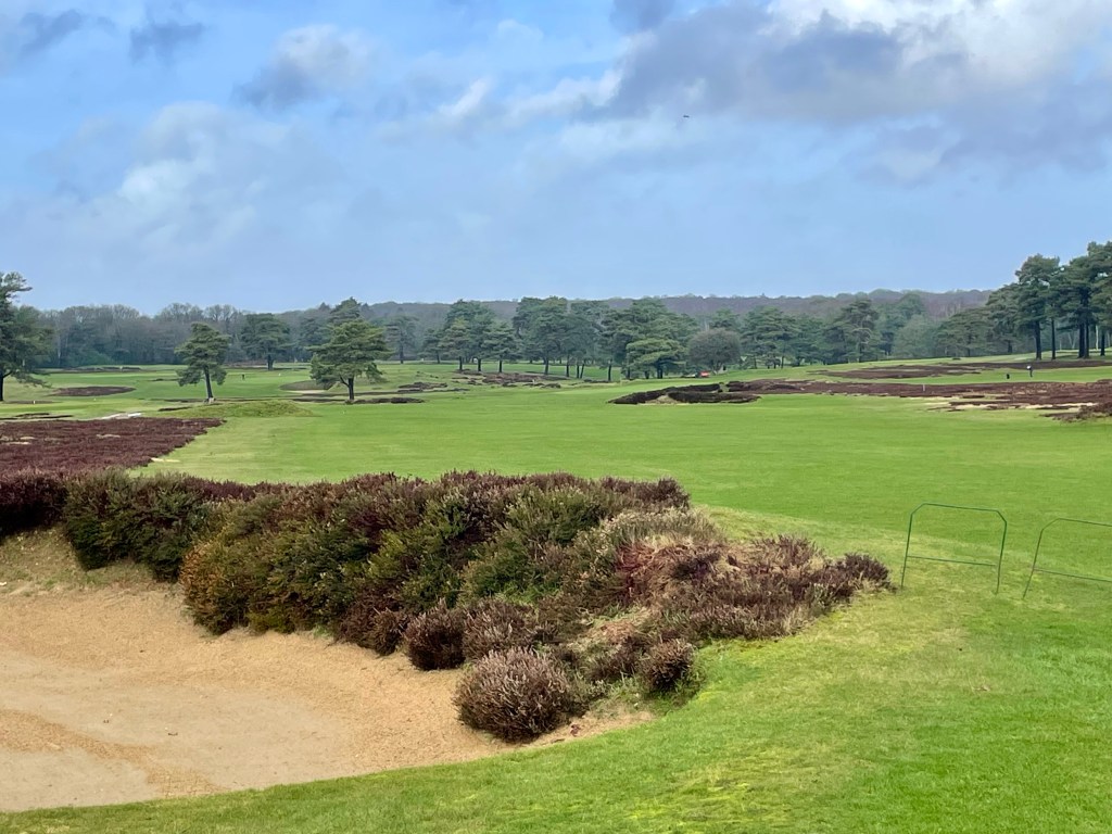 - 9th – an excellent heathland par four, with a fairway threaded through mature heather that l trees marking the apex of the gentle left turn in.